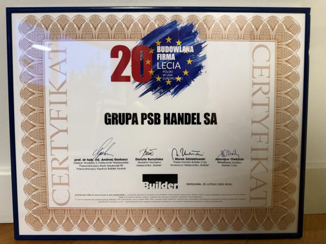 Grupa PSB została uhonorowana prestiżowym tytułem Budowlana Firma 20-lecia Polski w UE podczas Gali Builder Awards 2024! Uroczystość odbyła się 25 lutego 2025 r. w Hotelu Verte w Warszawie, gromadząc czołowych przedstawicieli branży budowlanej. Nagroda ta stanowi wyraz uznania dla liderów rynku, którzy przez dwie dekady przyczyniali się do dynamicznego rozwoju i modernizacji polskiego budownictwa.
